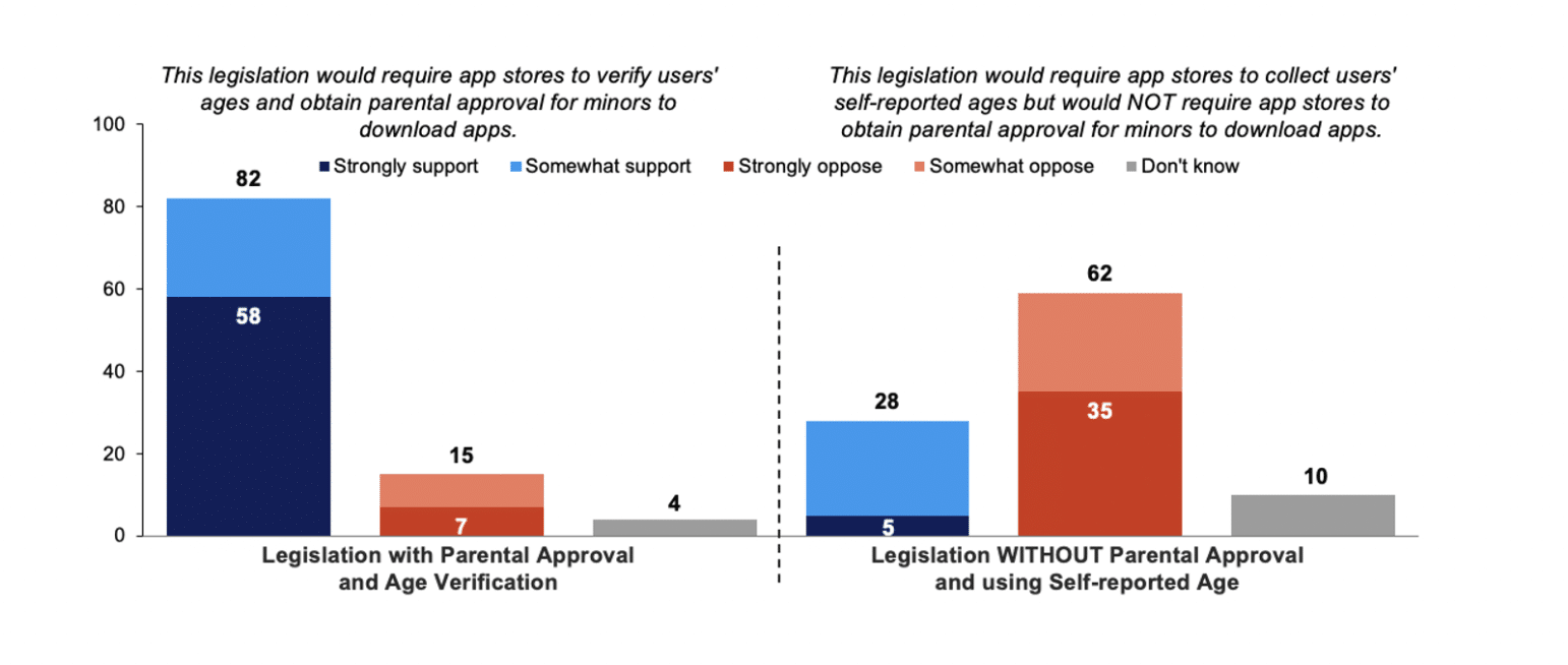 • 83% of voters, including 85% of parents support, requiring parental approval before minors can download apps.