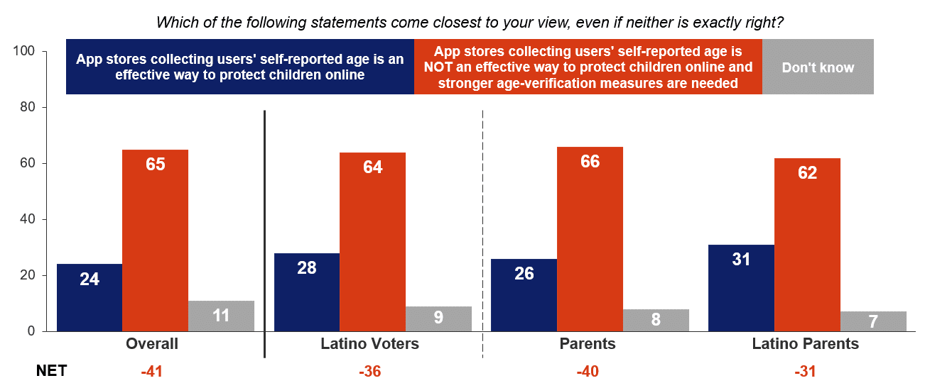 • Voters reject that collecting users’ self-reported ages is effective for keeping children safe online. Nearly two thirds of voters (65%) say app stores collecting users’ self-reported age is not an effective way to protect children online and that stronger age-verification measures are needed, while just 24% believe that collecting self-reported ages is an effective approach. This position is firmly held by Latino voters and parents as well.